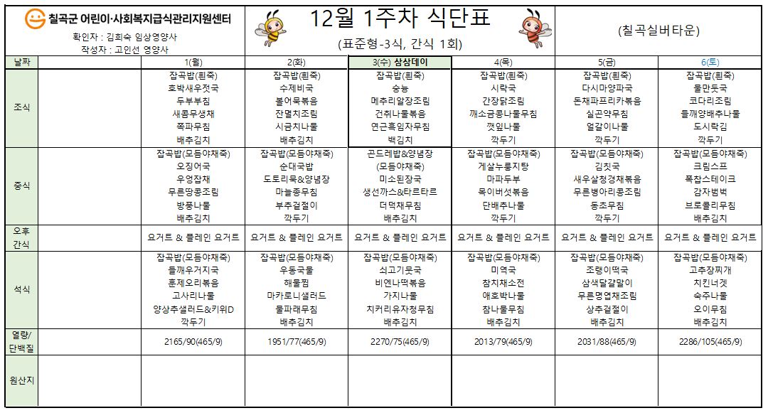 | Á¦ ¸ñ | 2025³â 12¿ù 1ÁÖÂ÷ ½Ä´ÜÇ¥ÀÔ´Ï´Ù. *^^* | ||