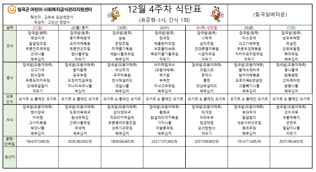 | Á¦ ¸ñ | 2025³â 12¿ù 4ÁÖÂ÷ ½Ä´ÜÇ¥ÀÔ´Ï´Ù. *^^* | ||