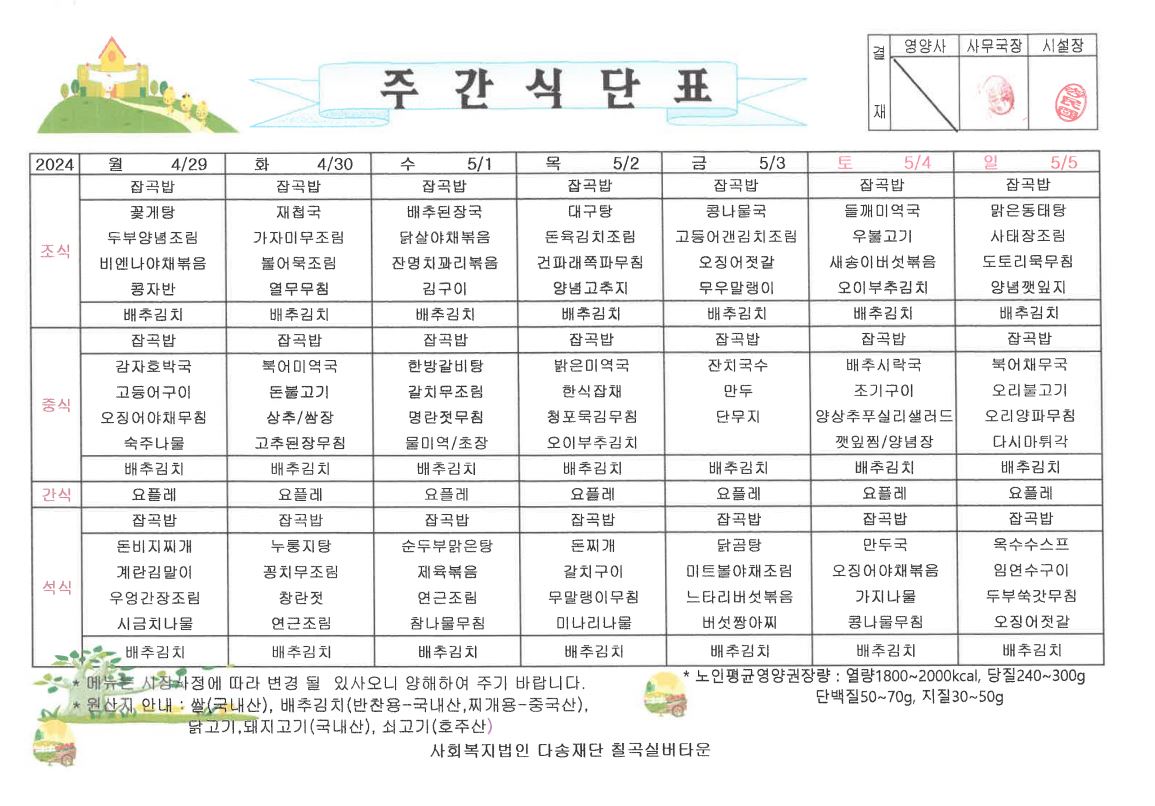 | Á¦ ¸ñ | 2024³â 4¿ù 4ÁÖÂ÷ ½Ä´ÜÇ¥ÀÔ´Ï´Ù. *^^* | ||