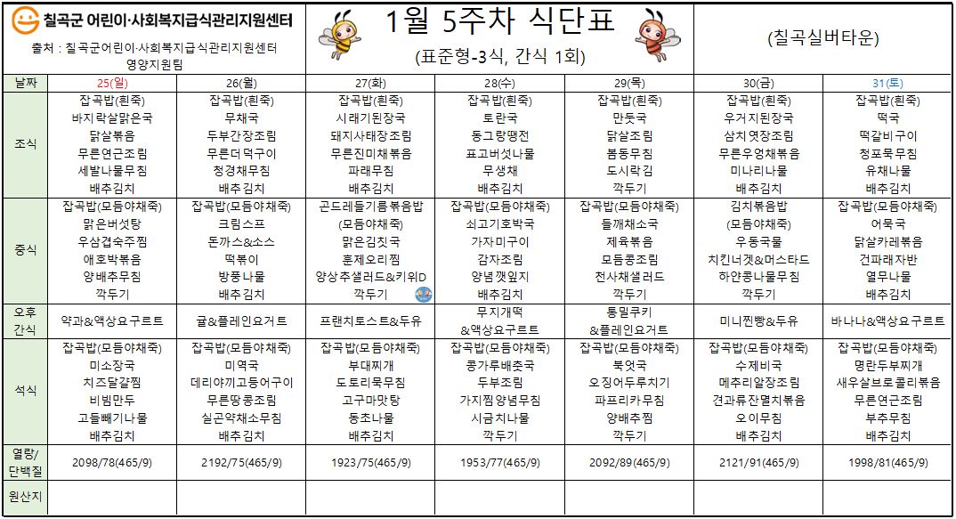 | Á¦ ¸ñ | 2026³â 1¿ù 5ÁÖÂ÷ ½Ä´ÜÇ¥ÀÔ´Ï´Ù. *^^* | ||